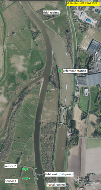 Het project heeft als doel de waterstandgegevens te verzamelen, ter voorbereiding van de eco-hydraulische planning van een vispassage. Vanwege de sterke asymmetrie van de getijden in de Eems werd gebruik gemaakt van het kleinst mogelijke meetinterval van 15 minuten. Het water komt hier snel op: binnen één tot twee minuten is het hoogwater, met waterstandverschillen van enkele decimeters per minuut. De zeer nauwkeurige sensormeting wordt uitgevoerd in een interval van zeven seconden en samen met de GPS-tijdscoördinaat opgeslagen. In plaats van een lineaire interpolatie van de latere metingen wordt een alternatieve aanpak gevolgd, waarbij gebruik wordt gemaakt van een nabijgelegen referentiestation, dat de waarde per minuut en de correlatie tussen de sensor en het referentiestation registreert. Dit station is volledig redundant en meet elke minuut. Het wordt permanent bewaakt en met het meetbord direct bij de sensorposities gekalibreerd.