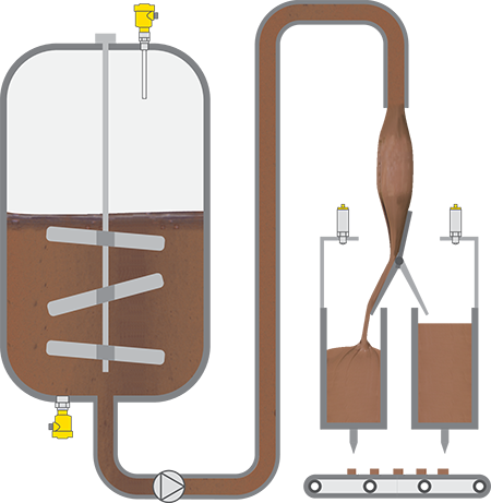 Na het concheren van de chocolade wordt de vloeibare chocolade in grote tanks gebracht om verder te kunnen worden verwerkt. In de tank zorgt een roerwerk ervoor dat de consistentie en de temperatuur van de chocolade gelijk blijven. Voor het regelen van het vulproces is in de chocoladetank en in de portioneertanks een betrouwbare niveaumeting vereist.