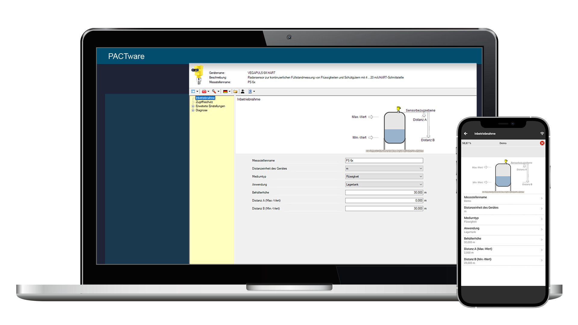 Afstandsmeetinstrumenten bepalen de afstand tot het mediumoppervlak en niet direct het niveau. Om het niveau te kunnen weergeven, moet de gemeten afstand vervolgens worden toegewezen aan de procentuele hoogte. Via dit inregelen wordt dan de vulhoogte berekend.