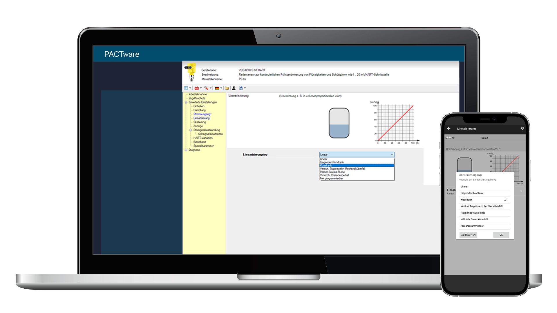 Een 'linearisatie' is nodig bij alle tanks waarbij het tankvolume niet lineair toeneemt met de hoogte van het niveau; bijvoorbeeld bij een liggende cilindrische tank. De linearisatiecurve geeft de relatie aan tussen de procentuele niveauhoogte en het tankvolume.