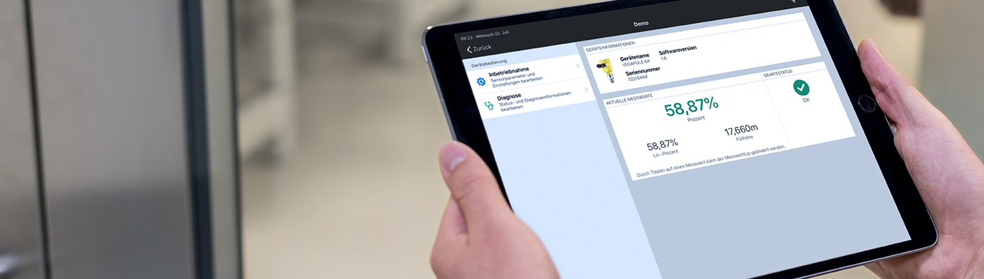 Radarsensoren moeten onder de juiste hoek worden gemonteerd, voor de juiste resultaten. Radarsensoren die in stortgoedsilo's worden gebruikt, moeten naar de uitgang van de silo worden gericht om bij het meten stortkegels te compenseren. De app helpt u de juiste hoek te vinden.