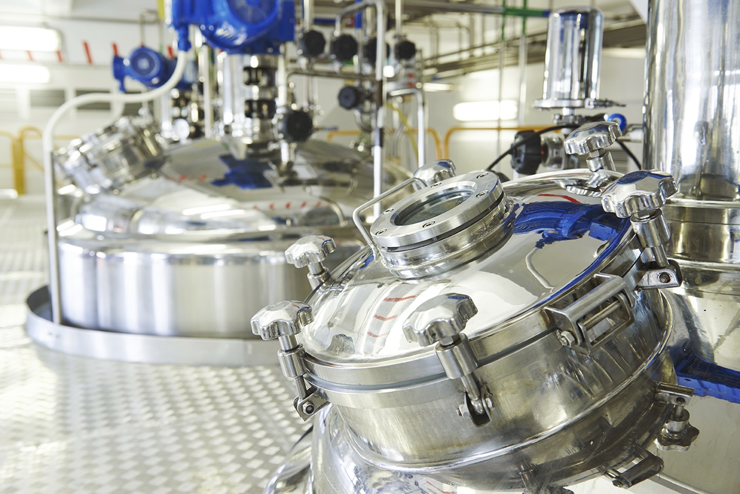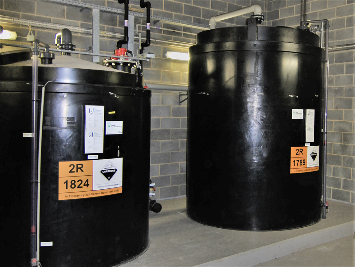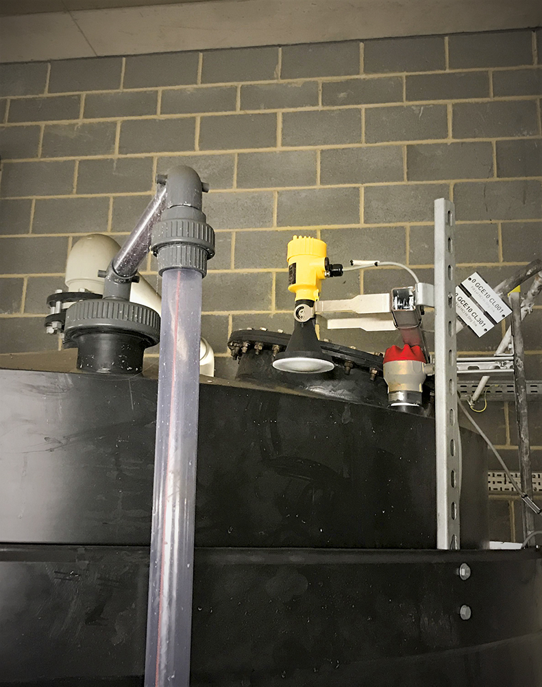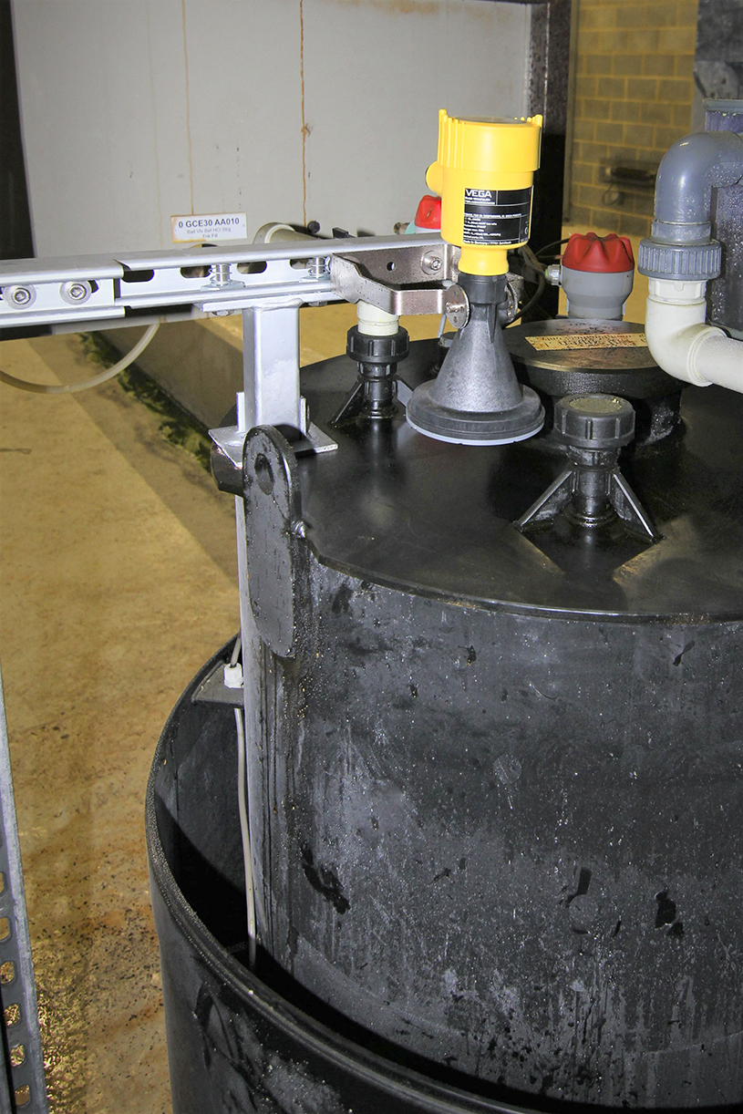 Boven alle kleinere dagtanks met zuren en logen zijn radarsensoren gemonteerd. Deze meten het vloeistofniveau van buitenaf op de tank.